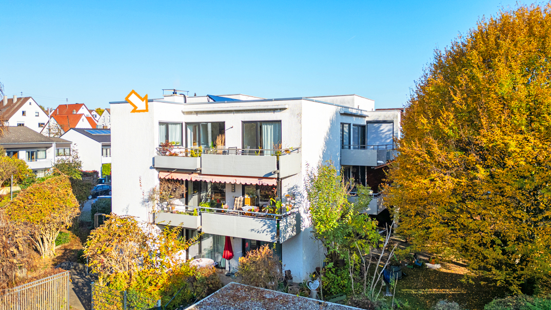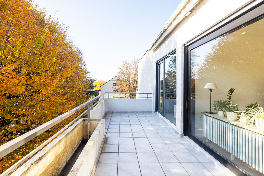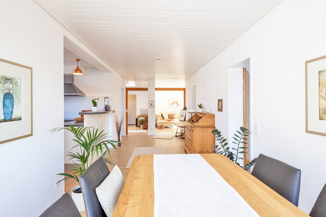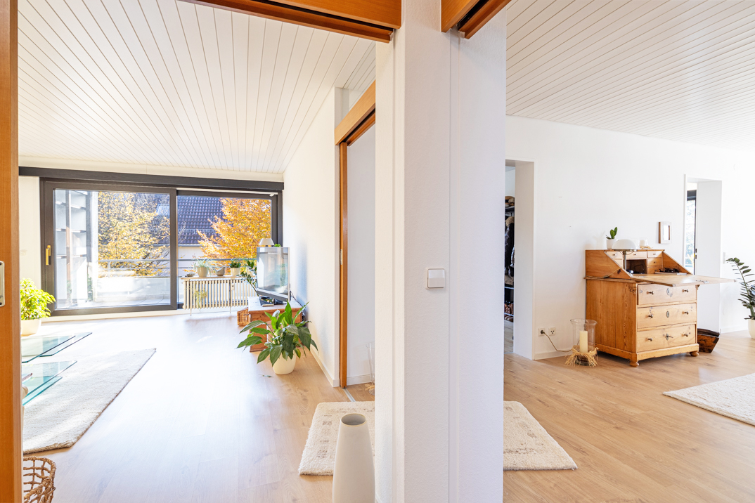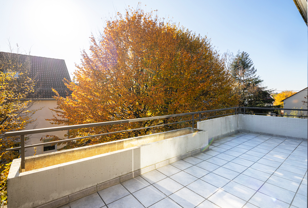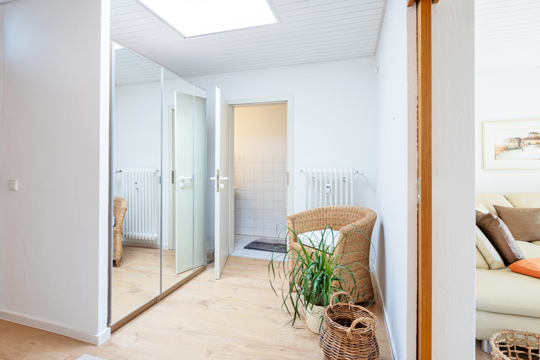 Stellen Sie sich vor: Ein sonniger Frühlingsmorgen. Sie öffnen die Fenster, und die frische Luft strömt von den nahegelegenen Wiesen und Feldern herein. Kein Lärm, nur Vogelgezwitscher, während Sie den ersten Kaffee des Tages genießen. Sie befinden sich im obersten Stock eines gepflegten Hauses, am Ende einer Sackgasse – um Sie herum angenehme Ruhe und über Ihnen nur der Himmel. Zugegeben, das klingt fast ein wenig zu kitschig. Wenn Sie aber nach einem Zuhause suchen, in dem Sie sich fallen lassen und ganz einfach wohlfühlen dürfen, dann sind Sie hier richtig.