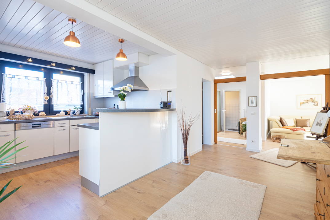 Da hier die Küche angrenzt, ist das Mehrzweckzimmer natürlich ideal als Essbereich. Aber auch andere Nutzungen sind denkbar: Eine Bar, eine Bibliothek, ein Fitnessbereich – bestimmt haben Sie schon eine Idee. Die Küche bietet einen modernen Komfort, ausgestattet mit Ceranfeld, Spülmaschine und einem großen Kühlschrank. Besonders clever ist die kleine Theke. Ein netter Treffpunkt, um ein wenig zu schwatzen oder schon mal ein kleines Entrée zu servieren.