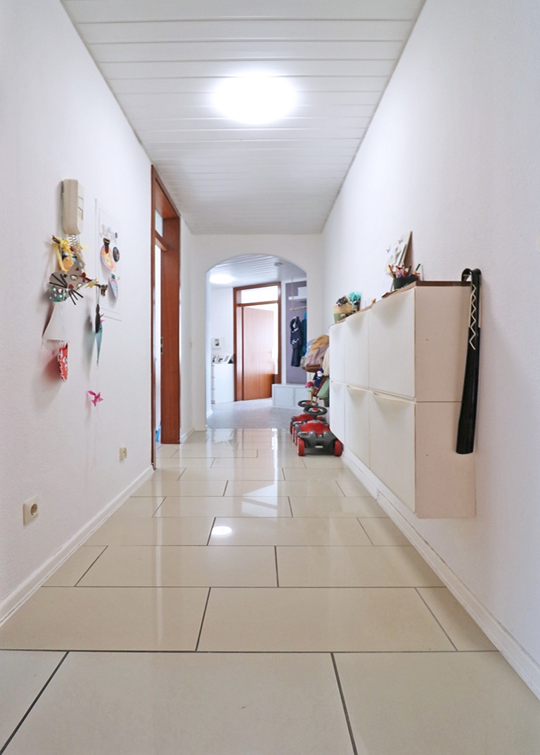 Doch schauen wir uns das mal etwas näher an: Ein langer Flur zieht sich durch die ganze Wohnung und verleiht ihr so Struktur. Von hier aus gehen alle Zimmer ab. Zum Beispiel der große Wohn- und Essbereich. Hier erleben Sie bereits den typischen Effekt der Dachschrägen. Sie schaffen eine wunderbar wohnliche Atmosphäre, die geradezu einlädt, sich zu zweit auf der Couch einzukuscheln und den Abend bei Kerzenschein und einem guten Film gemeinsam zu genießen.