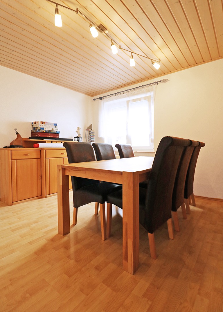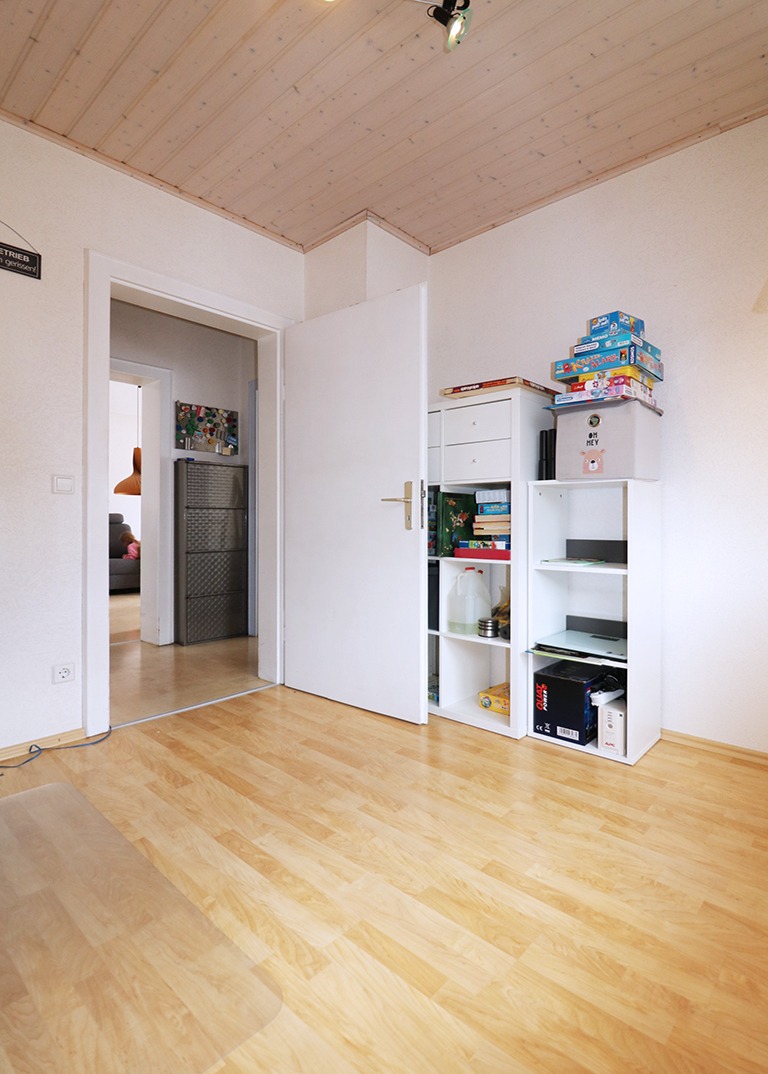 Im Obergeschoss befindet sich die größere der beiden Wohnungen. Auch diese macht doppelt Freude: zum einen durch ihre clevere Raumaufteilung mit Wohnzimmer, Schlafzimmer, Ess- und Arbeitszimmer (wahlweise Kinderzimmer), Küche und Bad. Zum anderen durch Extras wie den Südbalkon, einen Platz in der Doppelgarage und knapp 16 m² Abstellfläche im Keller.