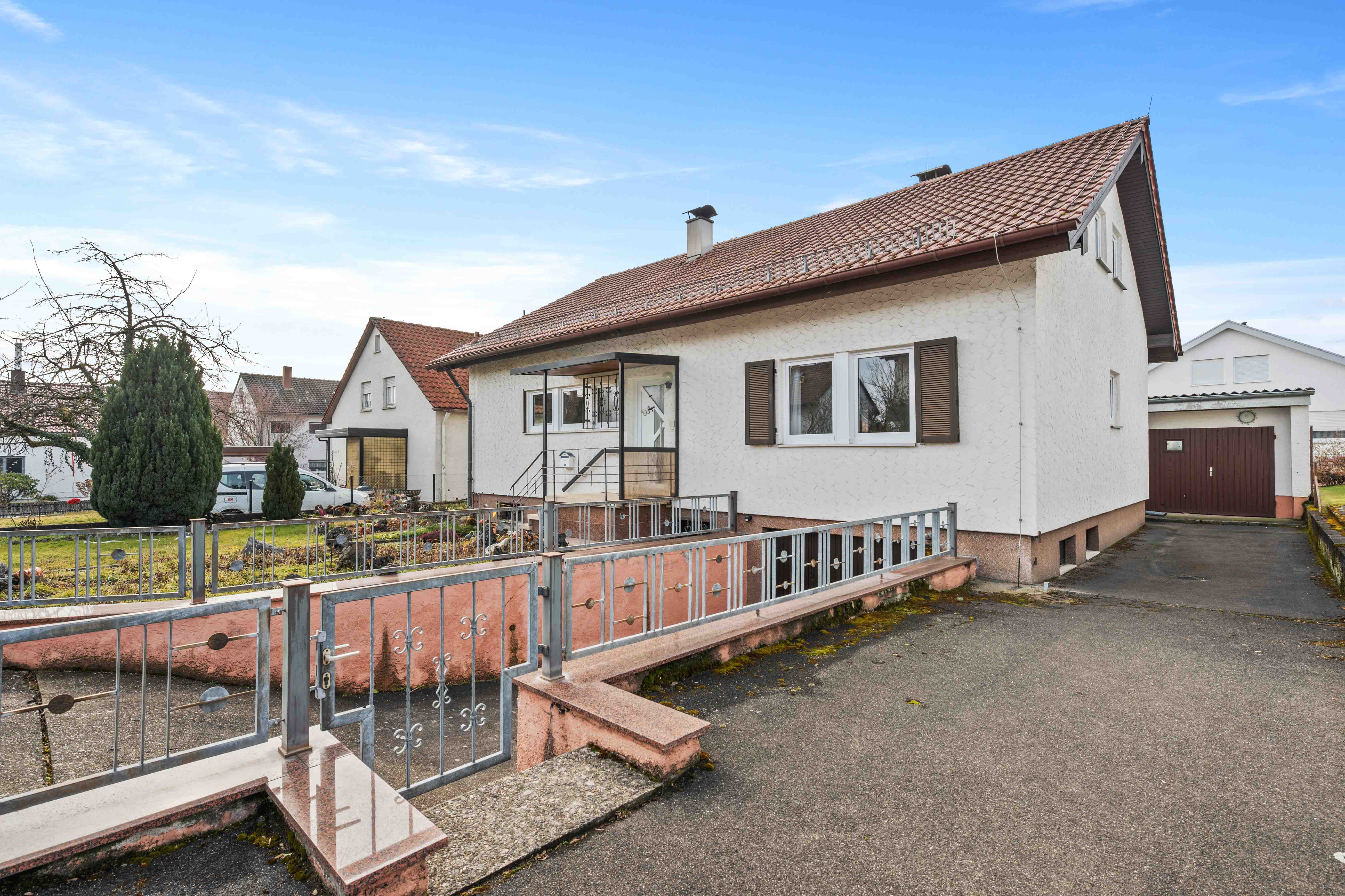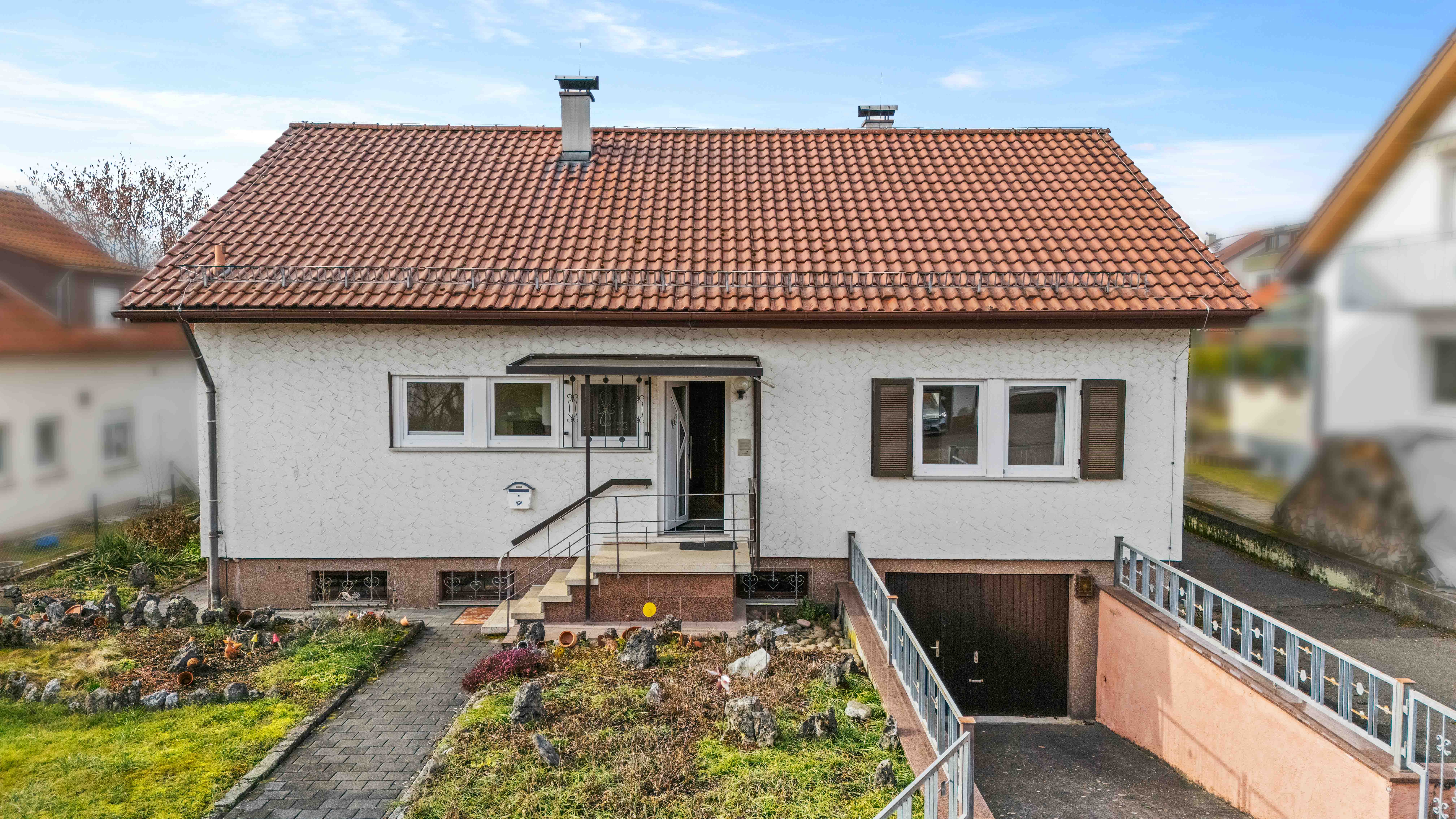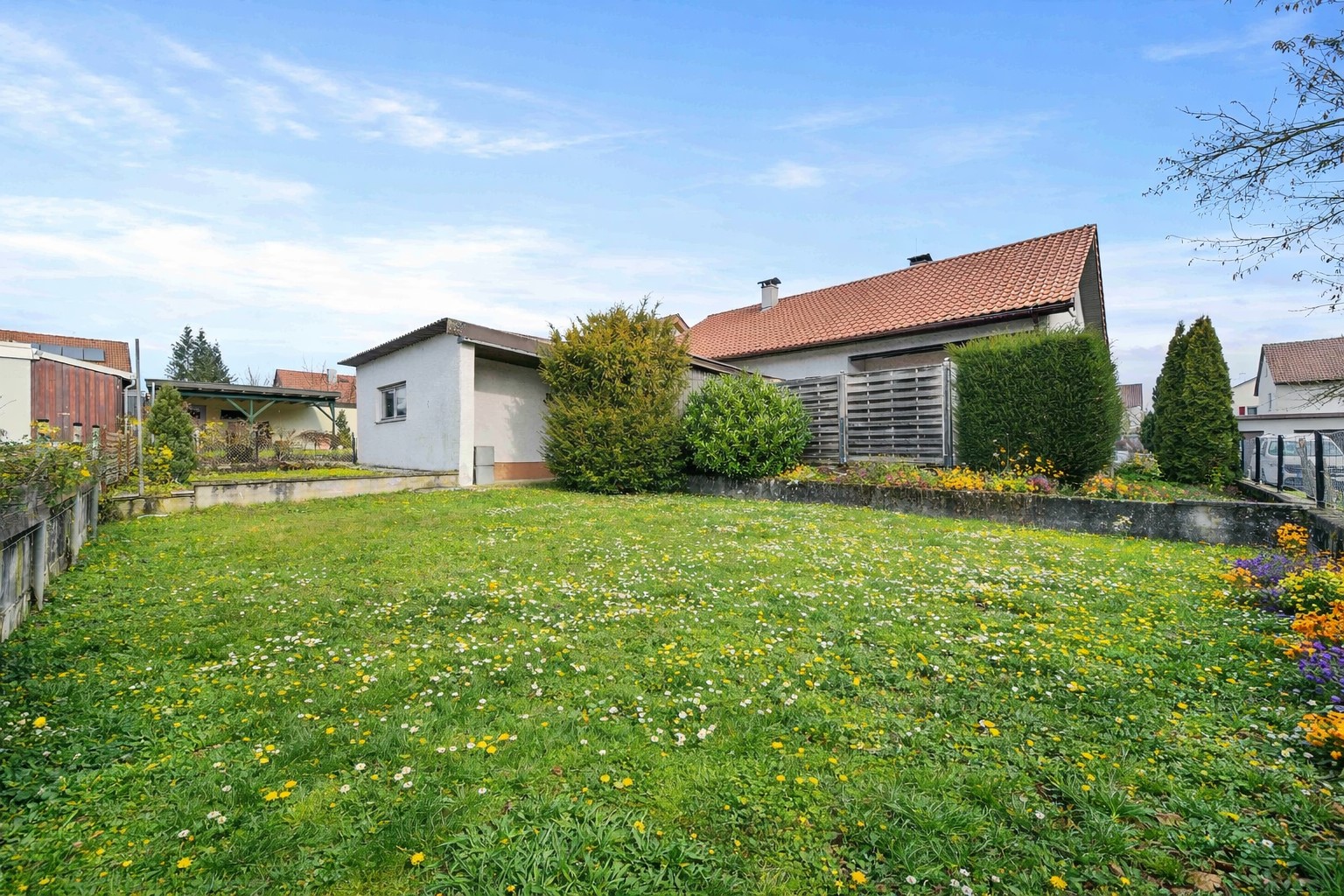 Was diese Immobilie besonders macht, ist das große Grundstück. Schon der große Vorgarten schafft Abstand zur Straße und verleiht dem Haus eine angenehme Präsenz. Hier entsteht Privatsphäre, noch bevor man das Haus betritt.