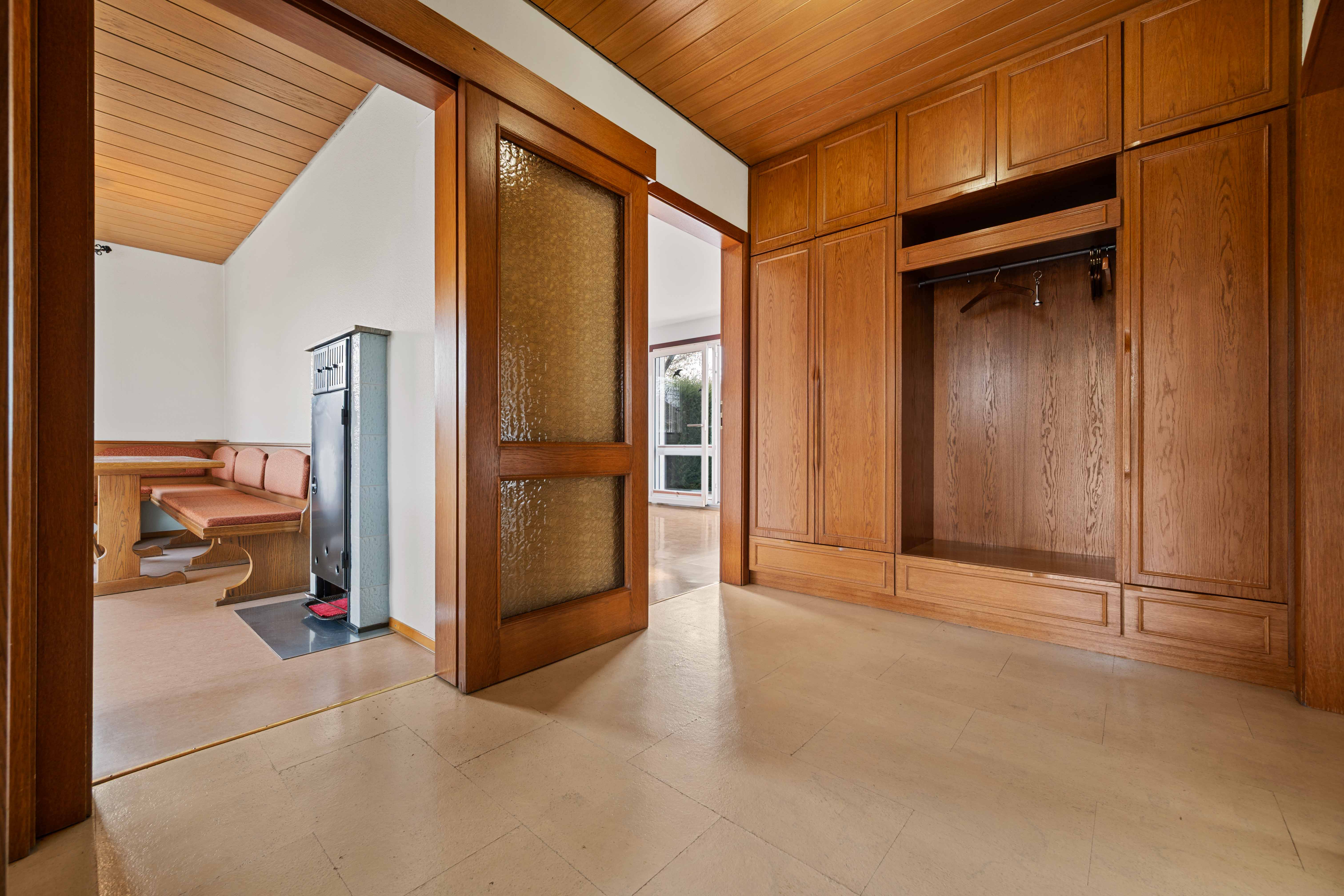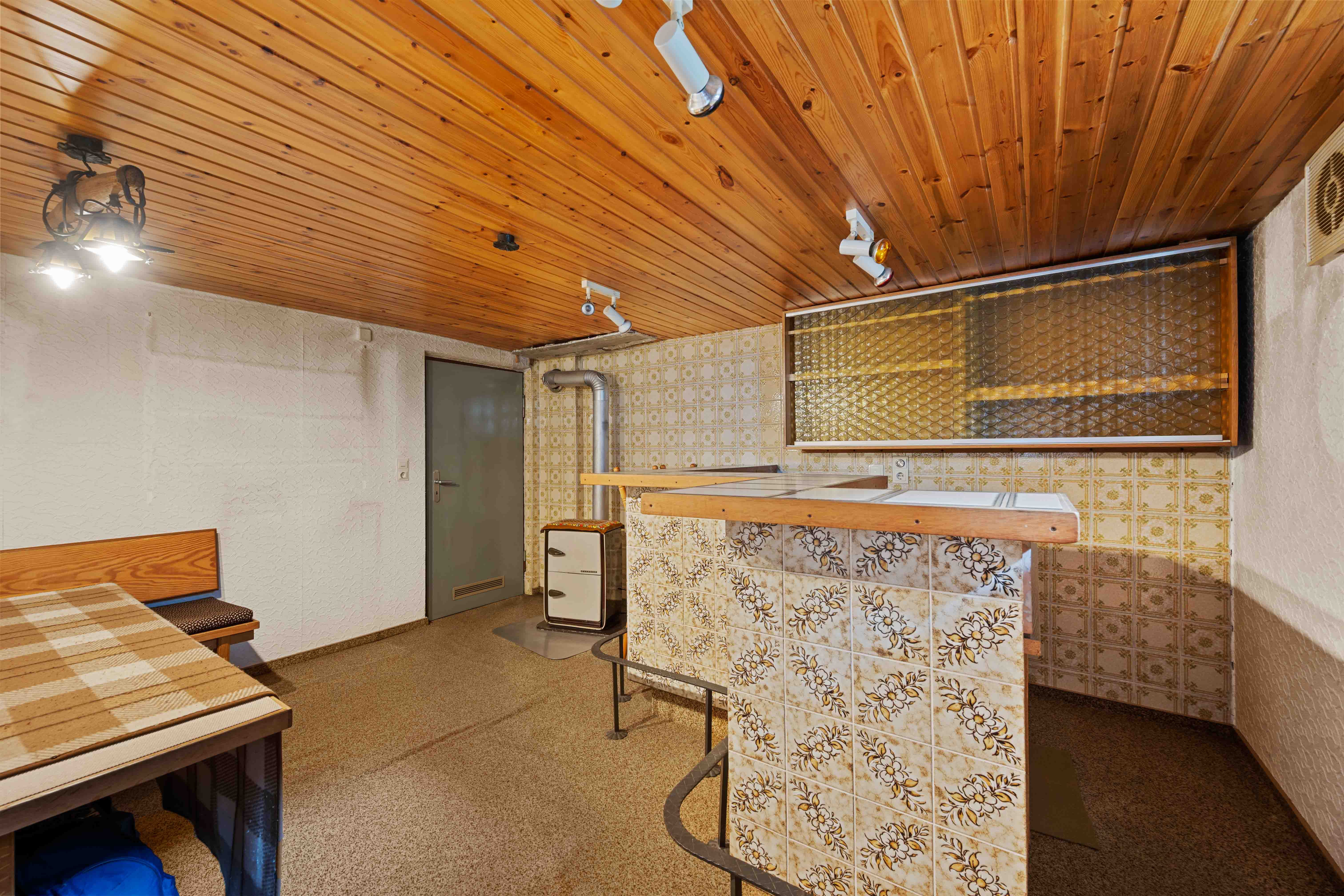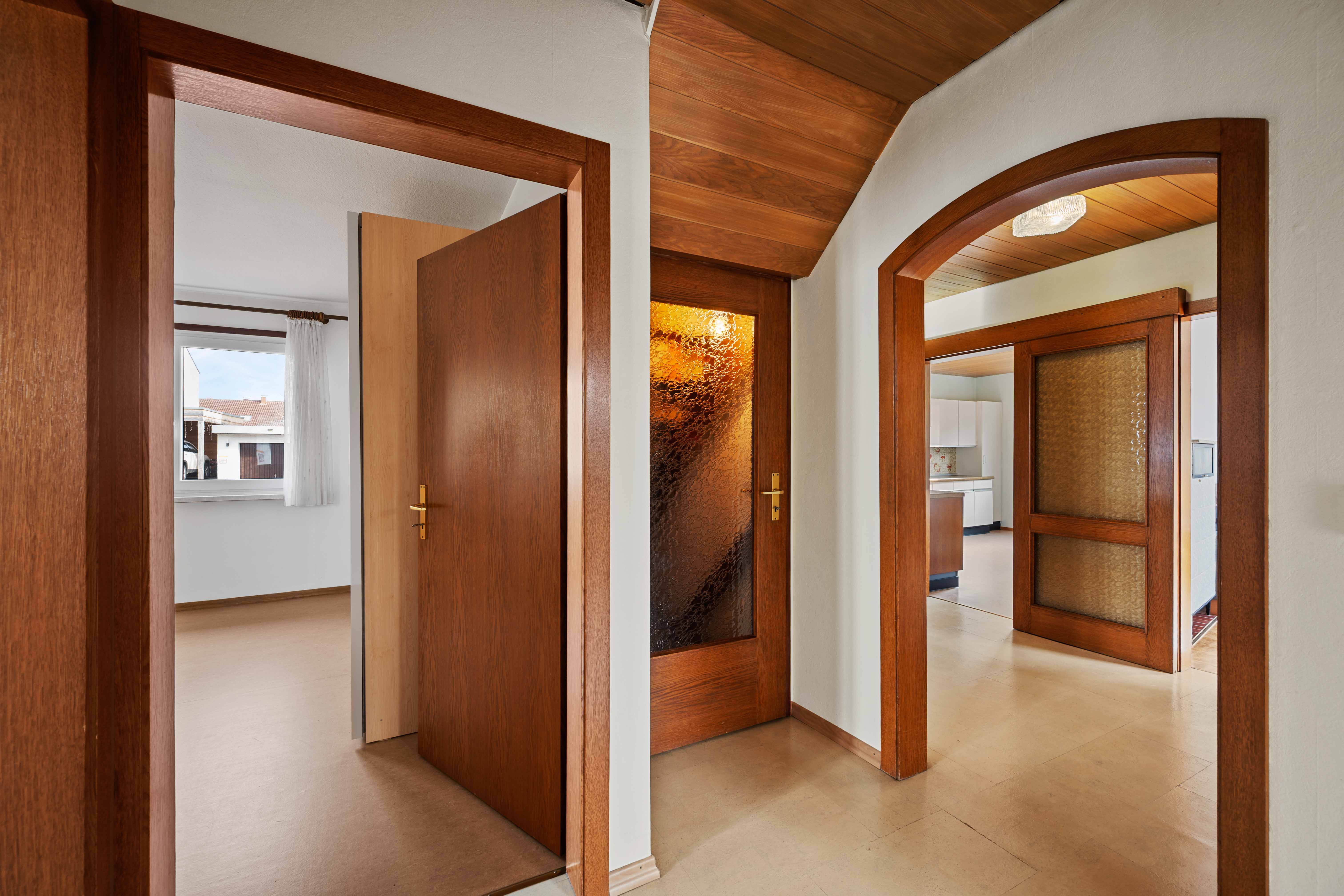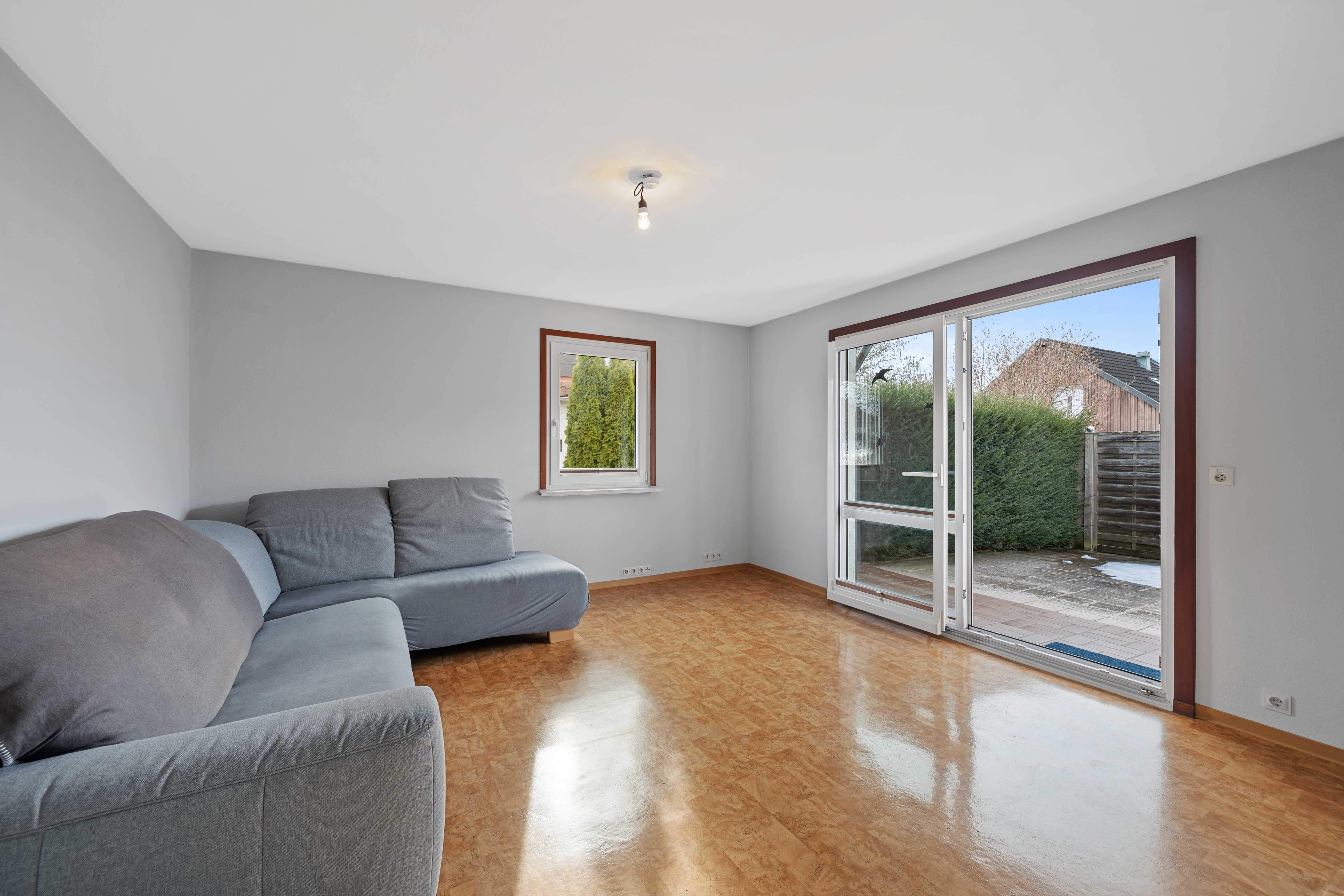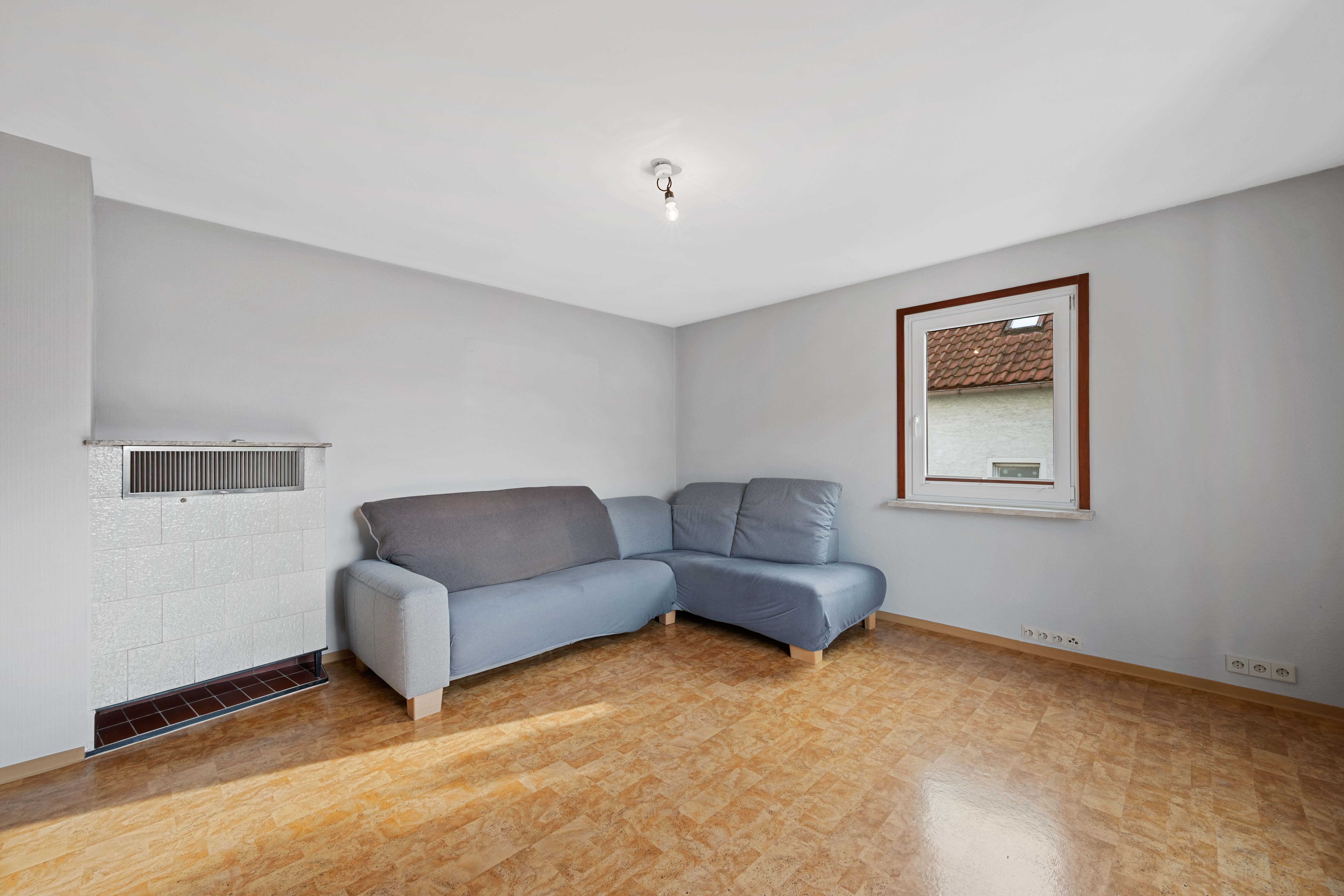 Das Wohnzimmer strahlt den typischen Charme der 60er/70er Jahre aus – gemütlich, klar gegliedert, mit einer Atmosphäre, die Wärme vermittelt. Hier geht es nicht um bodentiefe Glasfronten, sondern um ein behagliches Raumgefühl, das sich mit modernen Ideen neu interpretieren lässt. Mit einer zeitgemäßen Sanierung können Sie hier einen neuen Charakter mit modernem Wohnkomfort entstehen lassen.