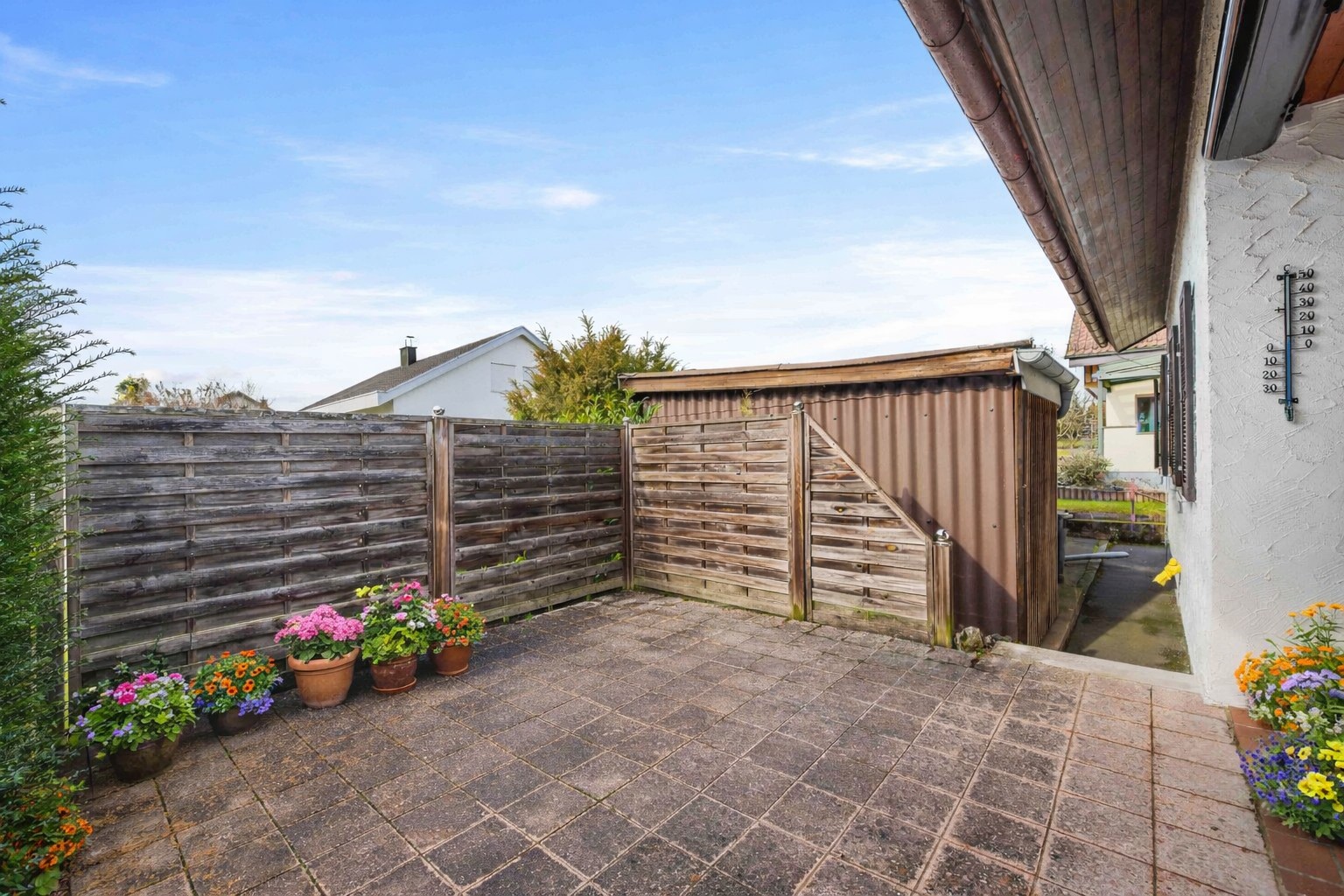 • Eine Terrasse sowie ein großer Garten in Westausrichtung bieten viel Platz für Entspannung sowie für gesellige Runden mit Familie und Freunden.