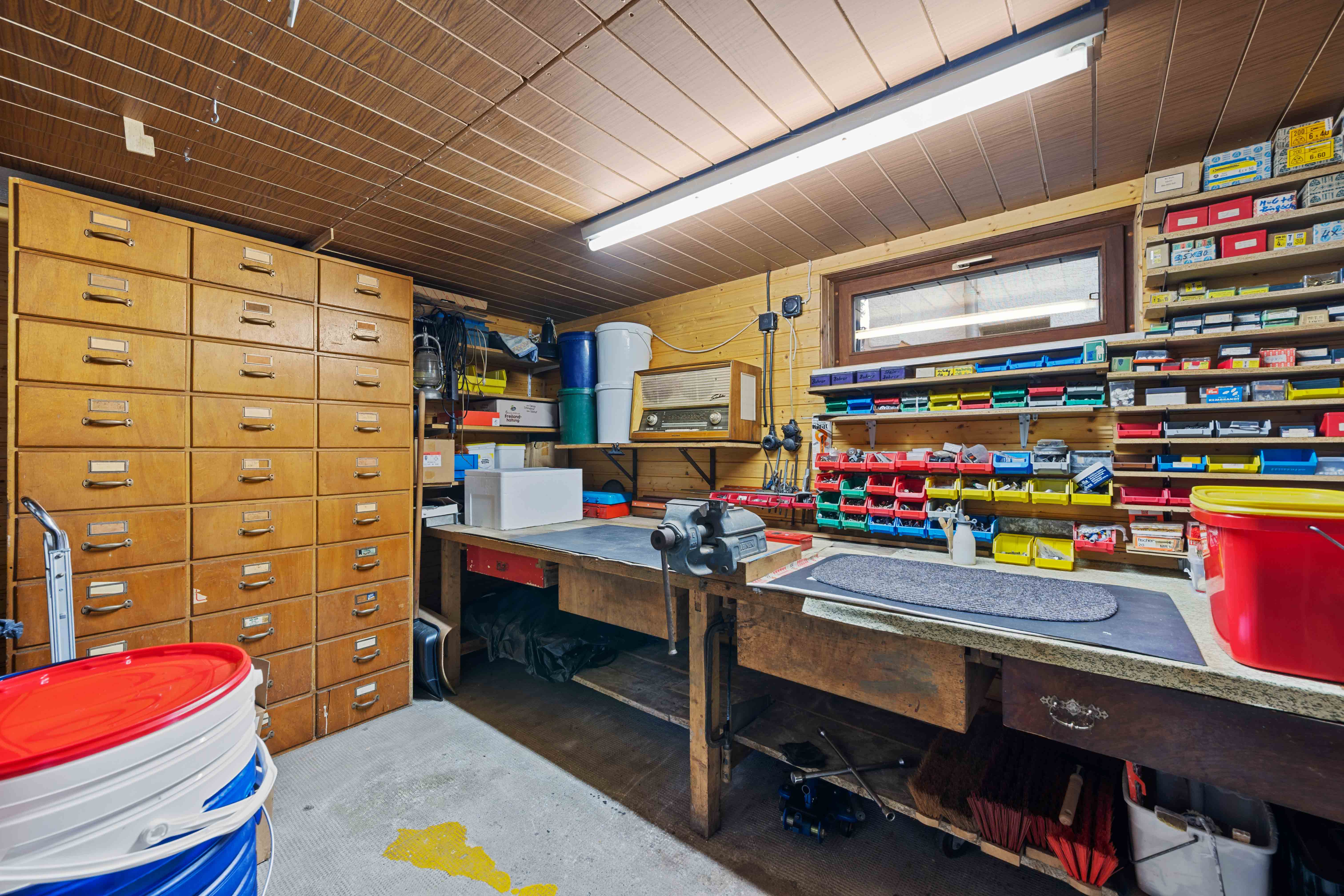Die geräumige Garage hinter dem Haus ist mehr als nur ein Stellplatz. Sie eignet sich auch hervorragend als Hobbywerkstatt, Kreativraum oder Lagerfläche. Ob Schrauben, Basteln oder Projekte verwirklichen – hier ist ein perfekter Raum für Ihre Ideen.